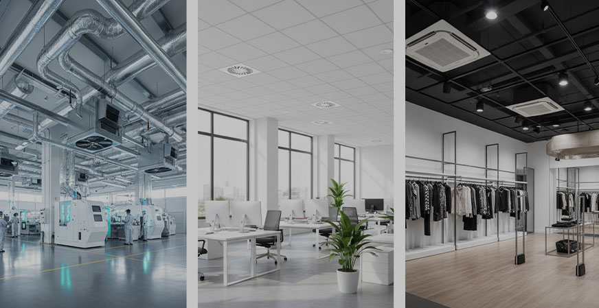 Fabrika, üretim tesisi, restoran, ofis ve AVM gibi alanlarda yüksek performanslı havalandırma altyapısı kurulur. Özellikle üretim alanlarında toz, duman ve koku kontrolüne yönelik özel çözümler uygulanır.